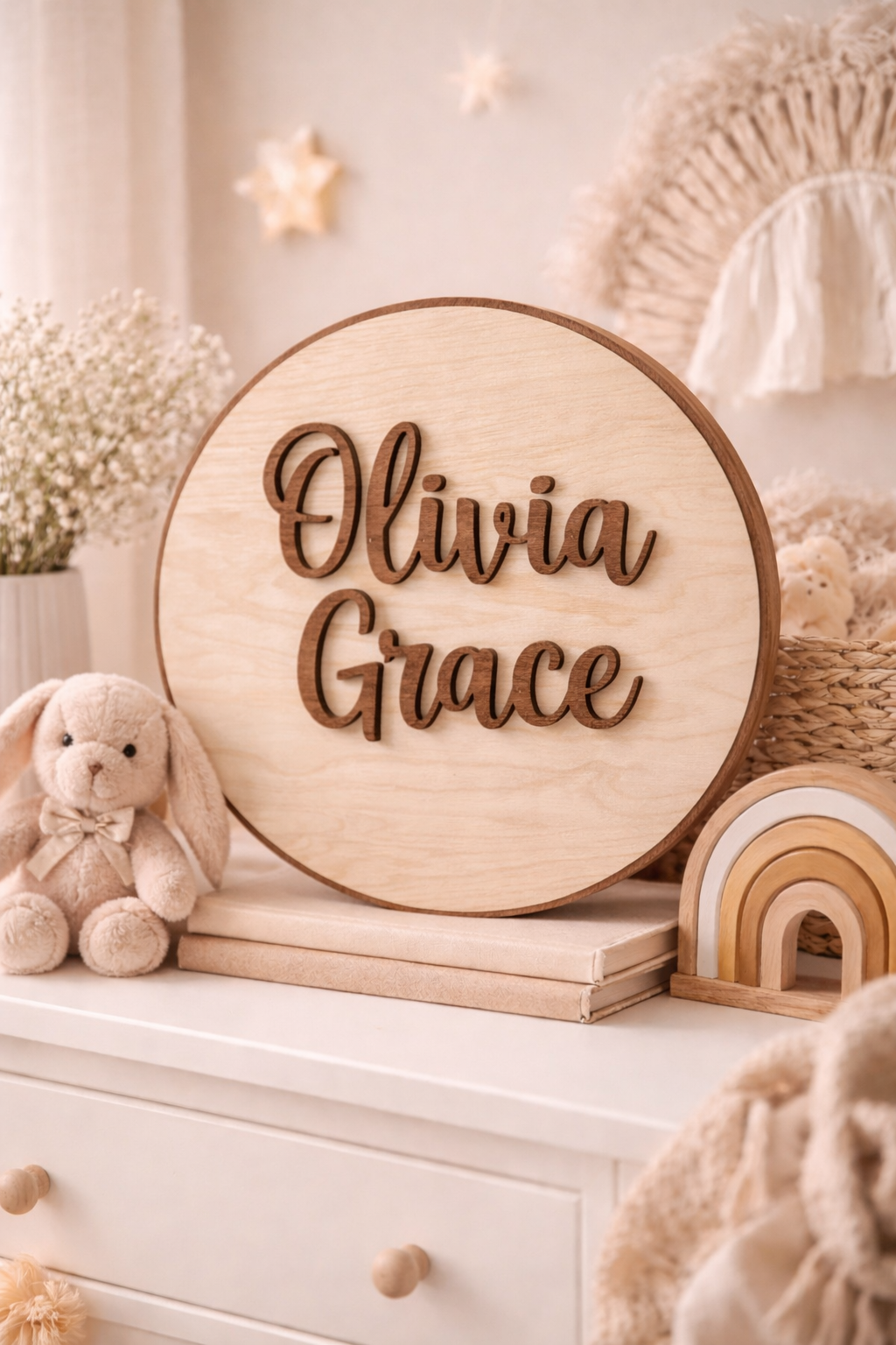 Each custom wooden sign is thoughtfully designed to complement a variety of spaces, from nurseries and children’s rooms to wedding displays and home entryways. The layered construction creates depth and dimension, giving each piece a refined, high-end look. Whether you’re celebrating a new baby, welcoming guests, or creating a meaningful gift, this sign is made to be both beautiful and lasting.